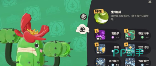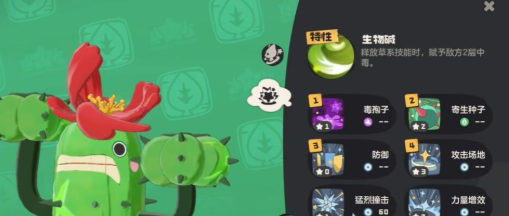 该精灵拥有“生物碱”特性,在释放草系技能时能为目标附加两层中毒效果,显著加快毒性叠加效率。技能搭配方面,推荐组合为寄生种子、毒液渗透与落井下毒。其中寄生种子每回合可吸取对手8%最大生命值,提供稳定续航;毒液渗透不仅能施加基础中毒状态,还附带直接伤害。需要注意的是,其输出爆发偏低,应避免与高爆发型对手正面交锋。