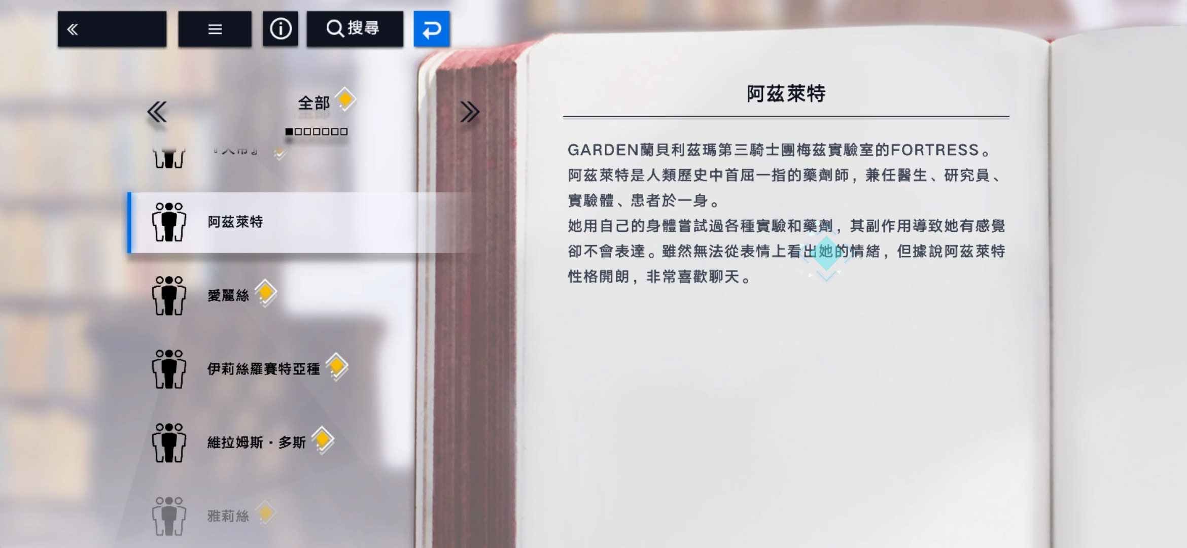 根据官方发布的人物设定,阿兹莱特被定义为人类历史上最杰出的药剂师之一,同时身兼实验体、患者与研究员三重身份。她常常亲自测试新研发的药剂与能量饮品,即使面临未知副作用也毫不退缩。虽然外表冷漠克制,实则内心温暖且乐于沟通,这种外冷内热的性格反差使她在角色阵容中显得尤为特别。