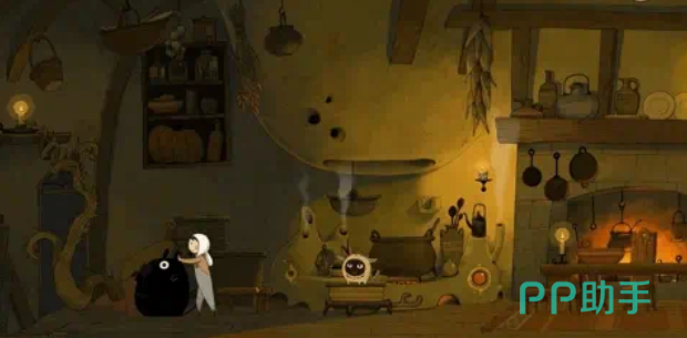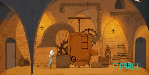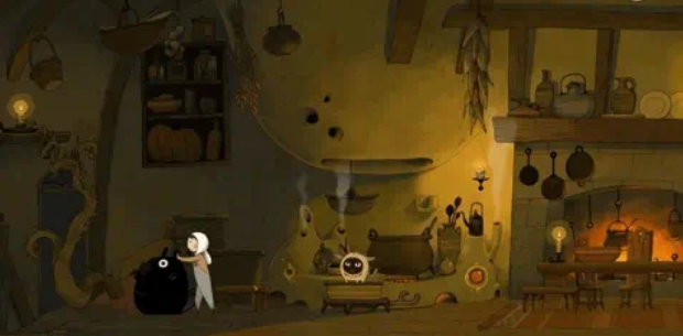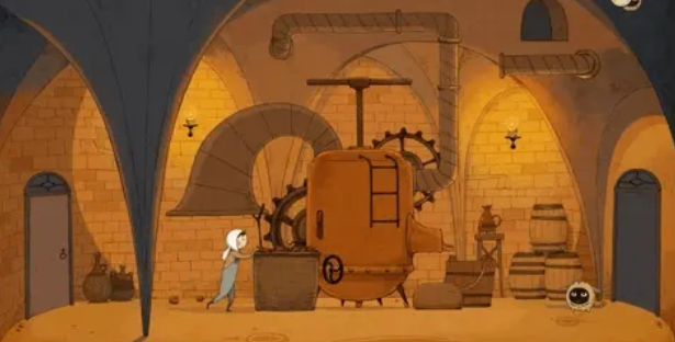 玩家需要做的是把装有苹果的筐子推到楼梯的下方,接着可以爬到锅炉的平台上。拉动左边的操纵杆在锅炉里面加上水,又把果筐放到左边的大吸管下方。猫在跳上发条之后可以从窗户出去,然后跳下来只需要顶走树枝就能通过。