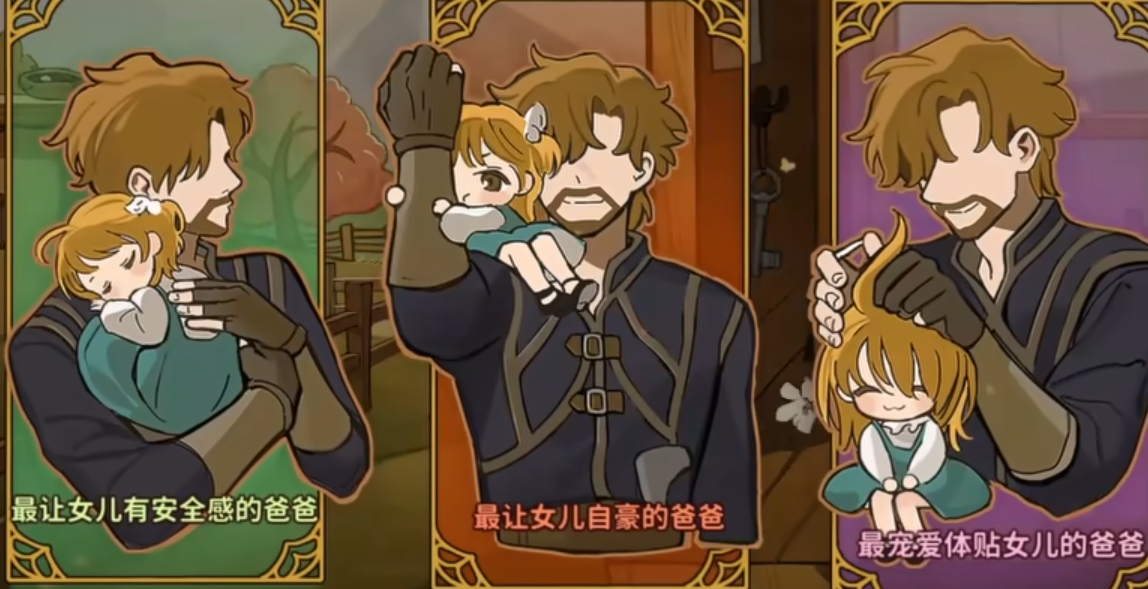 游戏初期会提供三种父亲类型供玩家选择:安全感型父亲可提升博学与善良;自豪型父亲则增加厉害与善良;体贴型父亲带来温柔与善良的加成。这三种路线各有侧重,但均以善良为核心属性,建议根据个人偏好进行开局选择,为后续养成打下基础。