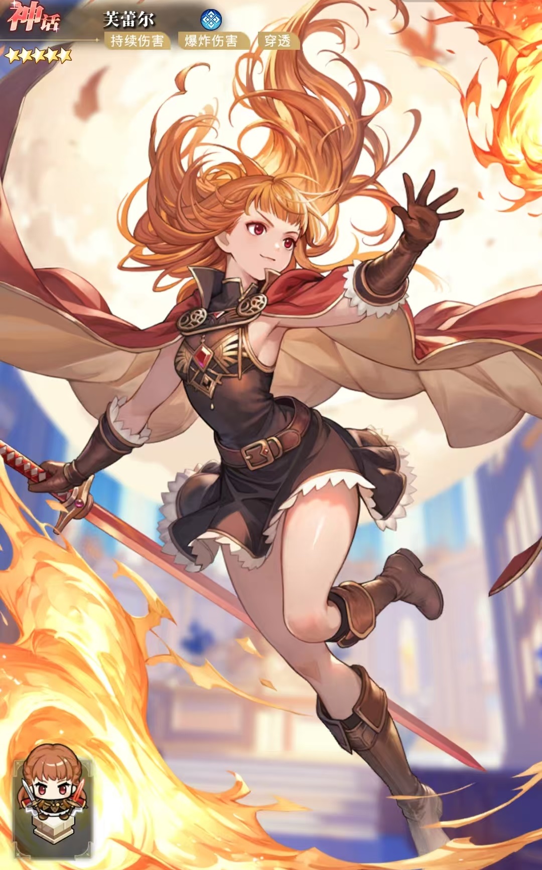 三推芙蕾尔(玩家俗称“小红帽”)——持续燃烧流代表。其穿透弹球附带点燃效果,可多层叠加并随时间持续造成伤害;当被点燃单位死亡时,将引发二次爆炸伤害,形成“DOT+爆发”双轨输出循环,适合应对高血量或群聚目标。