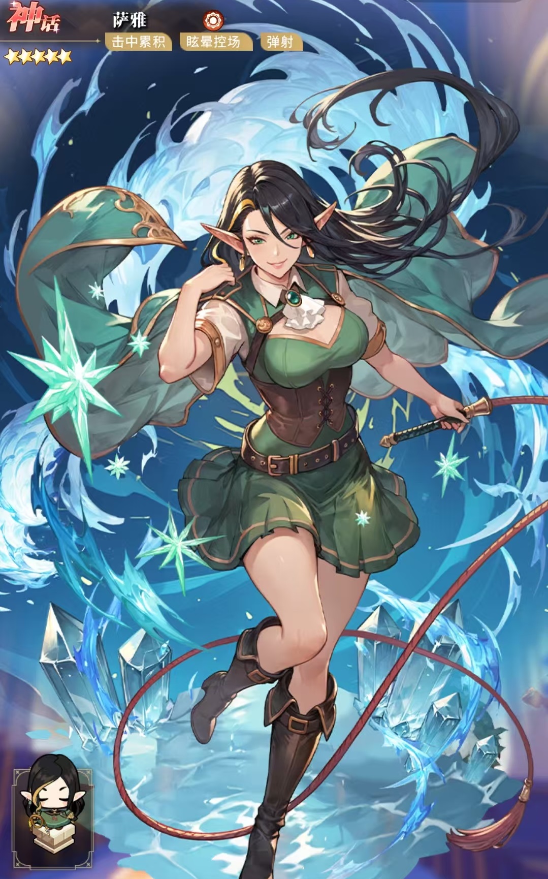 次推萨雅——高阶反弹系控场输出者。所释放弹球可在单体目标间最多弹射三次,第三次撞击时引发大范围召唤伤害。完成进阶后,弹球数量提升,并额外赋予眩晕效果与15%易伤状态,该易伤可叠加至10层,显著提升全队后续伤害转化效率,实现团队增益与硬控一体化。