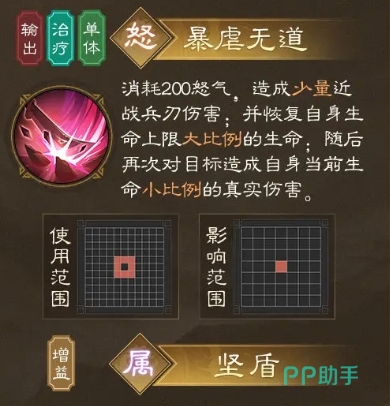 董卓的怒气技能暴虐无道是当怒气值积攒到200超气时,他便可以释放这一技能,释放时首先会造成少量近战兵刃伤害,对敌人进行初步的打击,随后他会恢复自身生命上限大比例的生命值,让自己迅速恢复到最佳状态,而最为关键的是在恢复生命值之后,他还会再次对目标造成自身当前生命小比例的真实伤害。