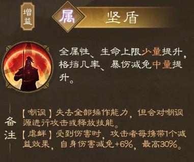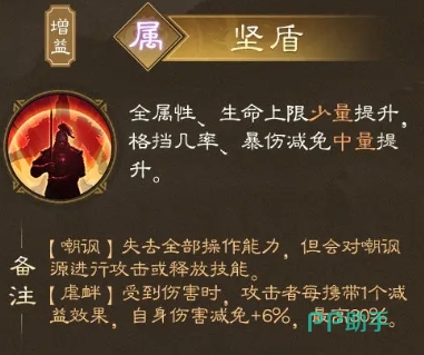 最后一个技能坚盾带来的增益效果更是全方位提升了董卓的战斗能力,它不仅能够使董卓的全属性得到提升,让其在各个方面都变得更加强大,还能少量提升他的生命上限,同时格挡几率和暴伤减免也会有中量提升,这使得董卓在面对敌人的攻击时,能够更加从容地抵挡伤害,减少自身所受到的伤害,此外嘲讽效果会让敌人失去全部操作能力,只能被动地对朝讽源进行攻击或释放技能,这在一定程度上限制了敌人的行动自由,而虐衅效果则使得董卓在受到伤害时,攻击者每携带1个减益效果,自身伤害减免便会增加6%,最高可达30%。