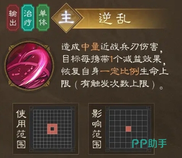 不仅如此他还会额外对这些敌方单位施加1层流血效果,这一效果将持续1回合,流血的效果是在目标行动结束后,会受到施法者一定百分比的攻击的真实伤害,而且这一效果最高可叠加2层,董卓的第一个主动技能名为逆乱,这是一个兼具单体输出和治疗能力的强力技能,当他发动这一技能时,会对目标造成中量近战兵刃伤害,目标每携带1个减益效果,董卓便能恢复自身一定比例的生命上限,不过为了避免这一技能被过度滥用,游戏设定了触发次数上限。