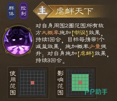 第二个主动技能虐衅天下则是一个强大的群体控制效果,在关键时刻董卓可以发动这一技能,对自身周围2圈范围所有敌方单位大概率施加嘲讽效果,持续1回合,这一效果能够吸引敌方的注意力,让他们不由自主地将攻击目标转向董卓,从而为己方其他单位创造良好的输出环境,而且目标每携带1个减益效果,施加嘲讽的概率便会少量提升,同时在对敌方施加嘲讽效果的同时,还会对自身施加虐衅效果,这一效果将持续3回合。