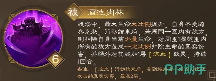 其天赋效果酒池肉林,在战场环境中,酒池肉林这一被动效果能够使董卓的最大生命值得到大比例的提升,而且更为重要的是,凭借这一天赋效果,他自身不受骑兵克制的特性得以进一步强化,当董卓在战场上行动结束后,若周围一圈内有敌方单位存在,便会触发一系列效果,首先他会扣除自身当前少量生命值,紧接着他会对周围1圈范围内所有的敌方单位造成一定比例扣除生命的真实伤害。