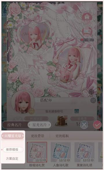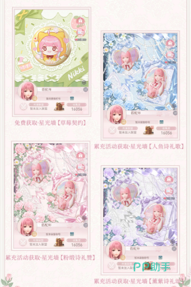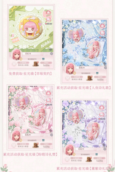 登录更新后版本,玩家将自动获得基础款星光墙“草莓契约”,无需额外操作或付费即可启用。若希望拓展更多视觉选项,可通过累计充值达2880点获取三款限定主题星光墙:“粉缎诗礼赞”“人鱼诗礼歌”“薰紫诗礼颂”。三款设计在色调倾向、纹理质感及主题意象上各具特色,满足不同审美取向的搭配需求。