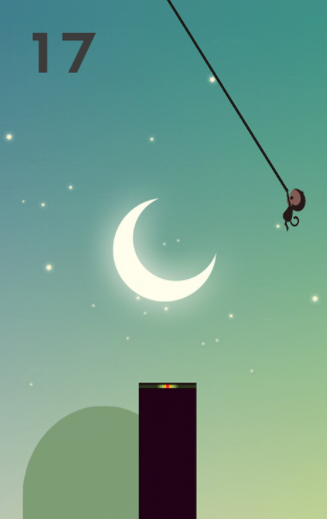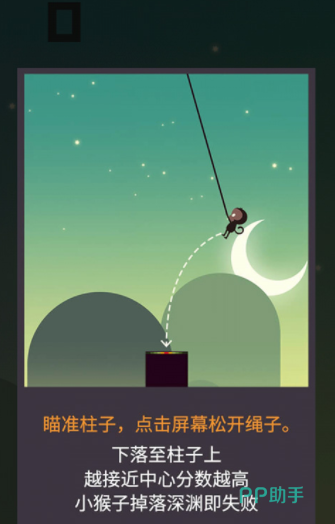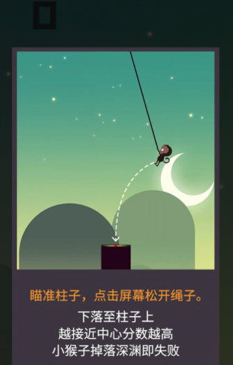 游戏里平台之间会有很远的距离,所以每次跳跃都需要借助绳子,这会比常规的跳跃难度更大,在下落的时候需要找准角度,才能让猴子跳跃到正中心分数最高的位置,距离中心位置越远,获得的分数就越少,如果掉下了平台,那么当前游戏就会结束,玩家只能重新开始继续挑战。