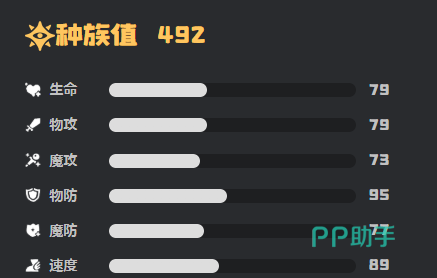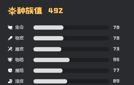 该精灵拥有翼属性与恶属性双重属性组合,总种族值为492。数值分布呈现高度均衡特征:各项能力无显著短板,亦无突出单项优势,整体表现为稳定、可靠、泛用性强的中坚型战力。