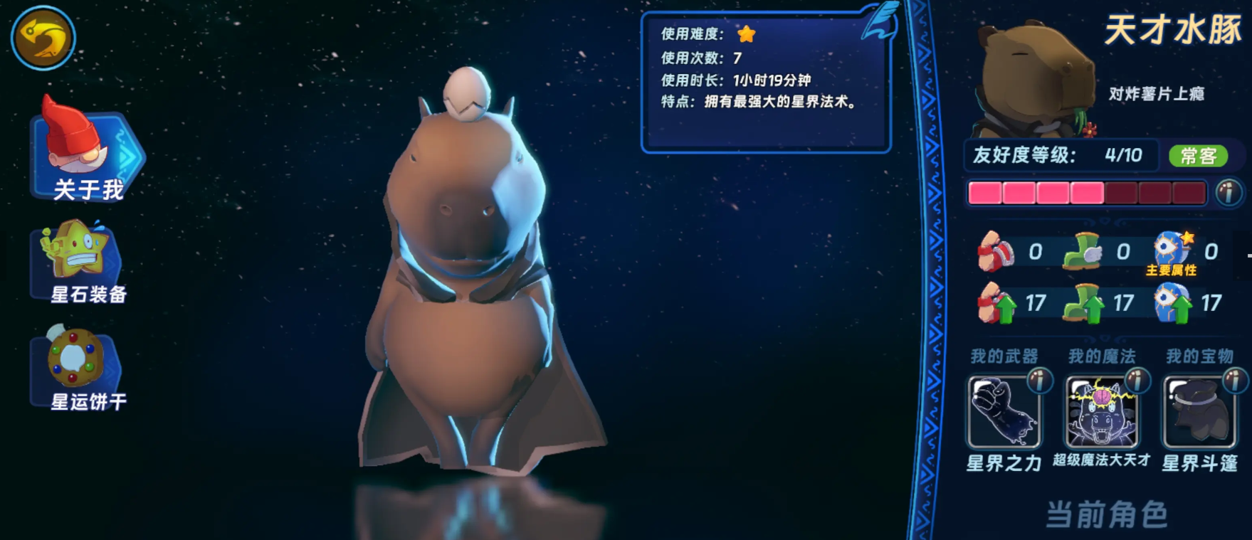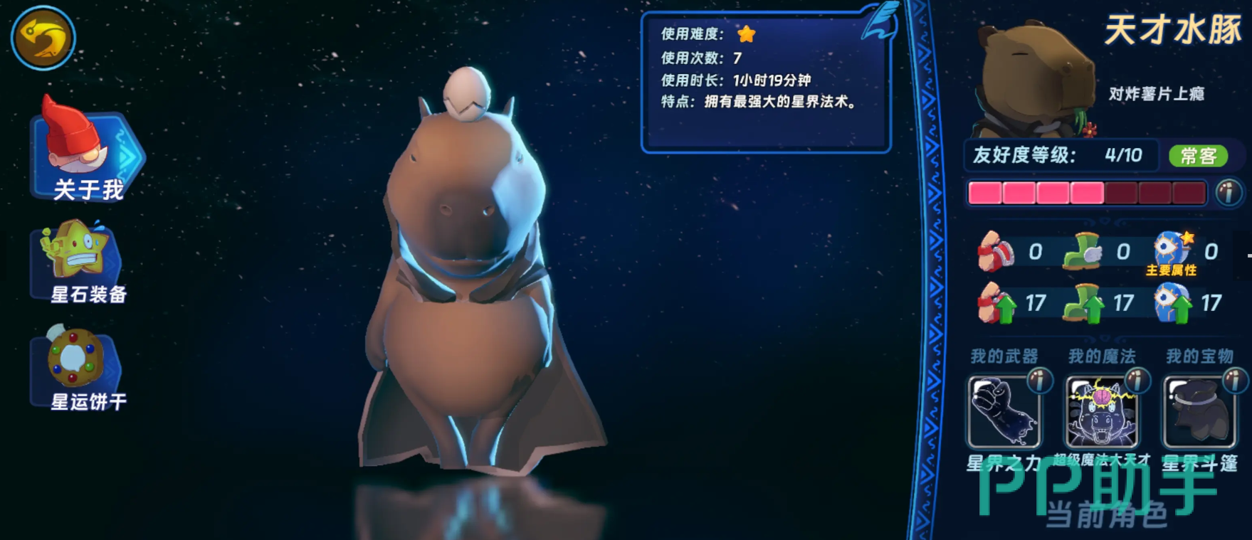 第二位推荐角色是“卡皮巴拉”(别名天才水豚)。其天赋侧重于法术强度成长曲线优化,初始法强基数高于同阶角色。培养重点在于宝物迭代节奏:须优先替换早期过渡性宝物,尽快装配黑色修饰念珠或三色羽毛等高契合度占卜道具。此类宝物可同步提升总攻击力与法术强化系数,形成正向反馈循环。在传奇宝物池中,卡皮巴拉对法强增幅类效果的转化效率尤为突出,因此整体输出模型更依赖持续稳定的法强堆叠而非单次爆发。
