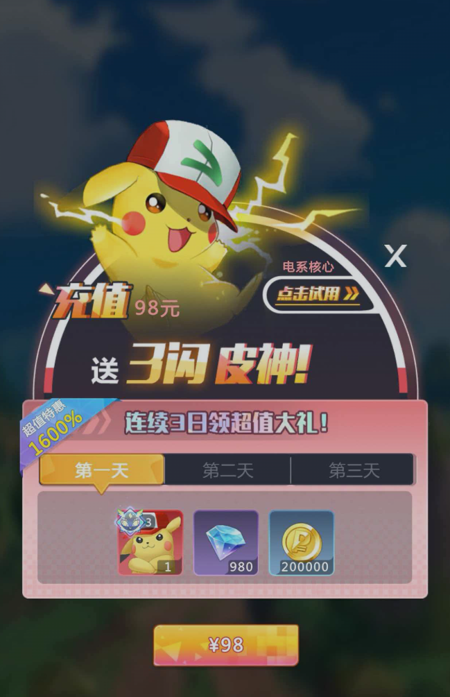 事实上,《冲吧小精灵》支持全程零充值畅玩。基础资源获取路径清晰,日常任务、活跃度奖励、副本通关及活动参与均可稳定产出金币、经验药水与突破材料。但对追求前期节奏、希望快速组建高战力队伍的玩家而言,适度充值能显著缩短成长周期。其中,首充礼包被广泛视为初期最具性价比的选择——尤其推荐98元档位,可直接获得稀有闪光皮卡丘,同时附赠海量钻石与金币,综合资源回报率接近16倍,大幅加速主力精灵的等级提升、技能解锁与阵容成型效率。