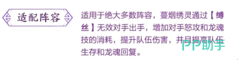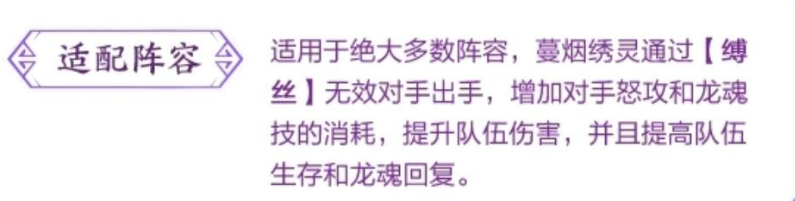 此外,蔓烟绣灵开启战斗后,使我方攻击前三名额外获得“牵线”状态。处于该状态的武将命中目标时,可附加“织线”效果;首次击杀敌方单位时,全队获得10%元炁,龙魂武将额外恢复2点龙魂值;攻击力最高者前三回合免疫斩杀,并在首次释放怒攻或龙魂技后回复20点命魂值。多重保护机制有效提升核心输出的容错率与持续作战能力。