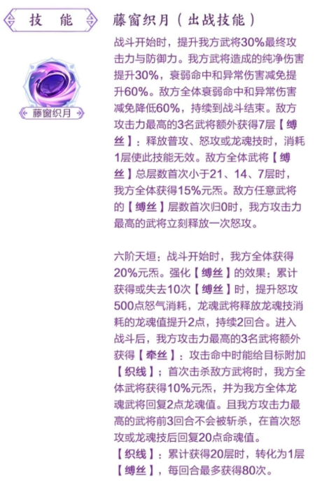 其核心机制“缚丝”具备强节奏压制力。开局自动对敌方攻击力前三名武将施加7层缚丝。每当目标发动普攻、怒攻或龙魂技,即消耗1层并使本次攻击无效。当敌方缚丝总层数首次降至21层、14层、7层时,全队获得15%元炁。该设计显著压缩敌方前中期有效输出窗口,为我方争取关键发育与爆发时机。