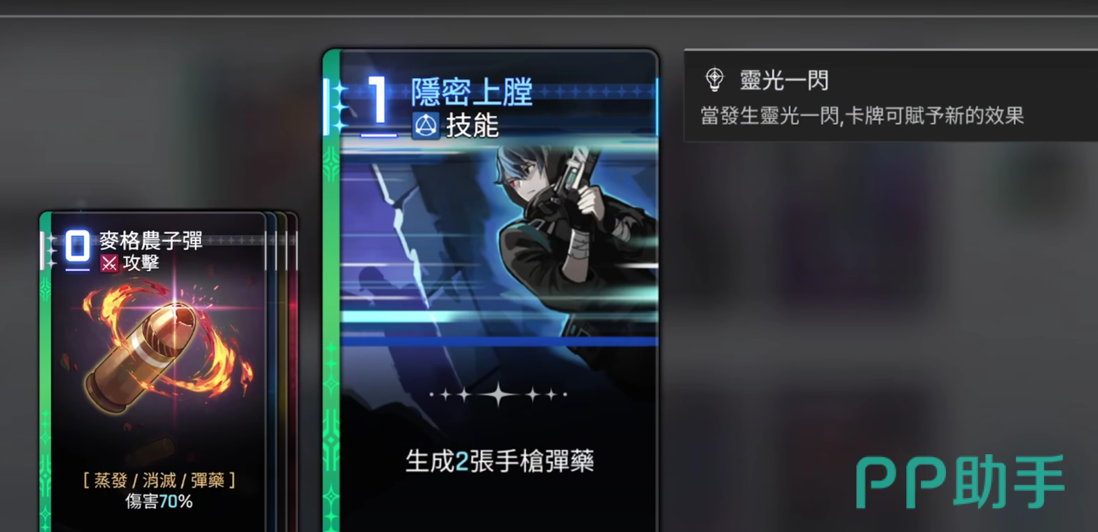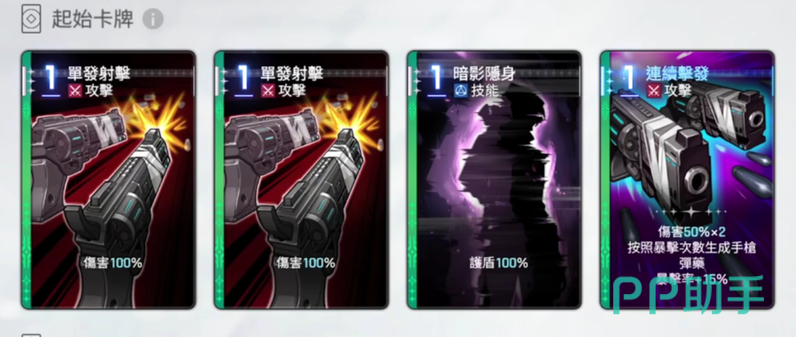 第二张独特卡“隐秘上膛”可在战斗中为玩家额外获得两张手枪弹药,强化后续技能衔接;第三张卡则提供相当于生命值100%的护盾,并设定当使用弹药类卡牌时,基础伤害提升至120%,大幅增强攻防转换节奏。第四张卡“魔眼乱舞”则具备伤害叠加机制——使用的弹药卡越多,该技能造成的伤害越高,适合在高资源状态下打出爆发性输出。