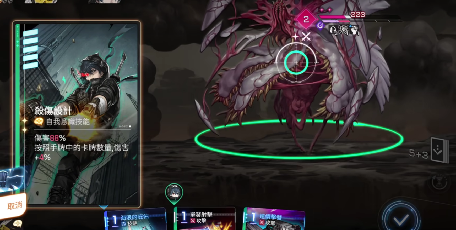 第五张关键卡为其终极技能,基础伤害为100%,且随着攻击卡使用次数增加而提升角色整体伤害。释放大招后,伤害倍率直接跃升至250%。值得注意的是,该技能的最终伤害加成依赖于已使用的弹药数量,而非剩余卡牌数,因此建议在释放大招前优先清空手中弹药,以实现最大化的输出收益。