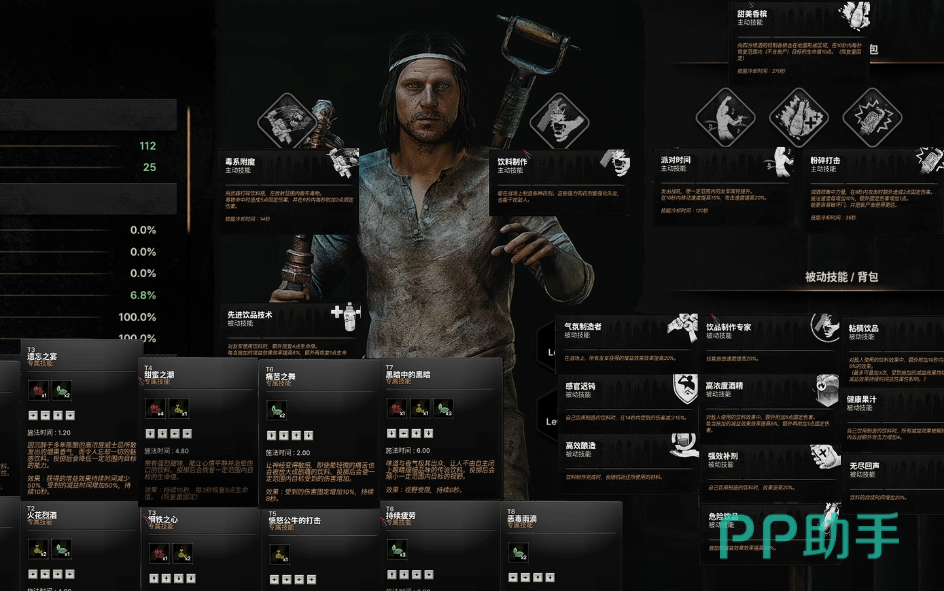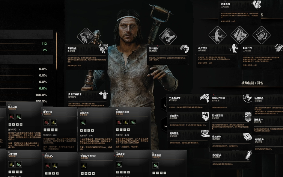 调酒师定位为功能型辅助,自身直伤能力有限。核心输出方式为投掷特制酒瓶,破碎后生成持续毒雾区域,造成范围持续伤害。其战略价值集中于酒品调配系统:每种酒液均可激活一项全队增益,包括但不限于攻击力提升、防御力强化、精神值恢复速率加快等。该角色在组队挑战高难度首领战时表现突出,单人作战效率相对偏低。