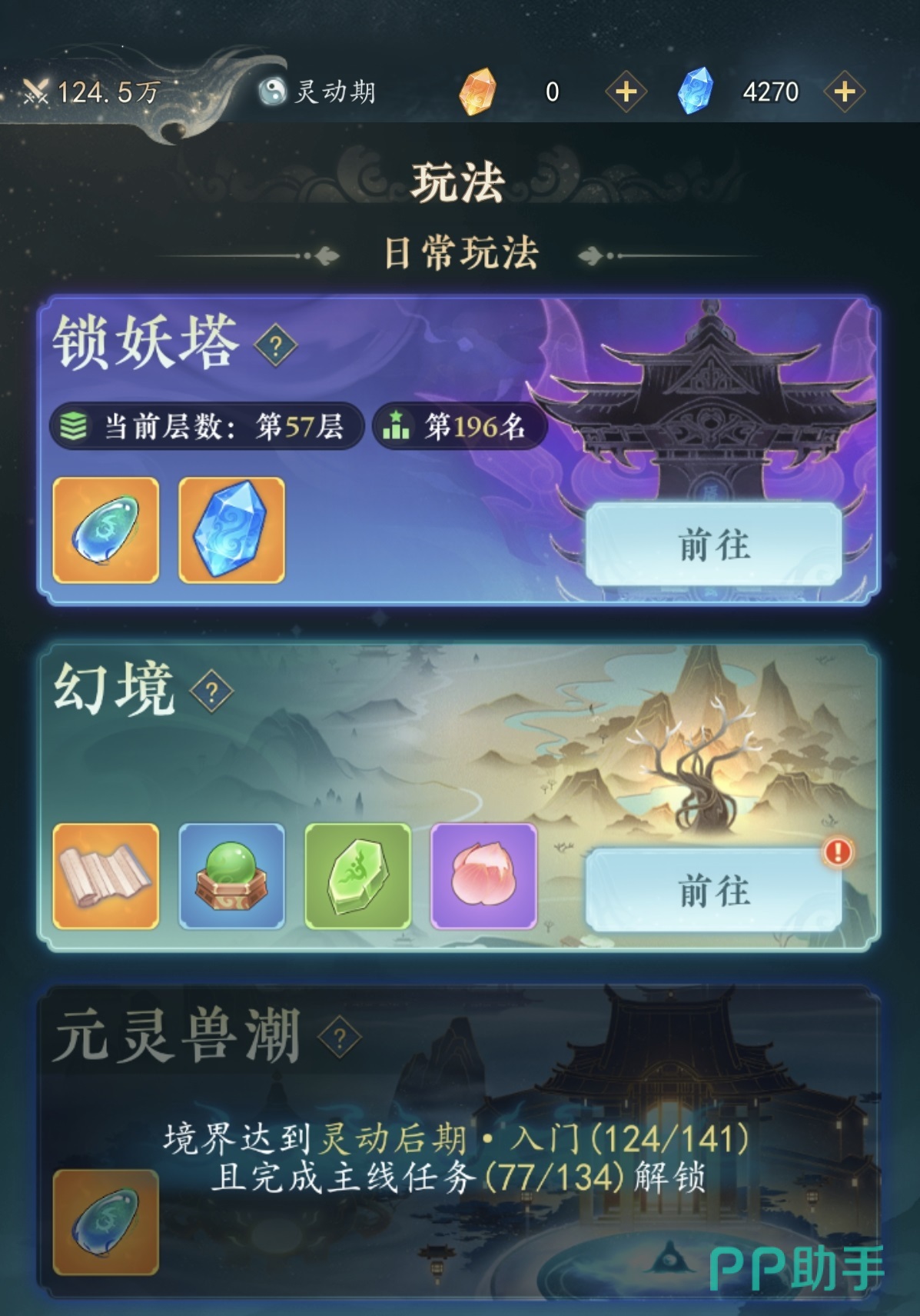 锁妖塔的核心产出为元灵与源点。元灵经吐纳操作可转化为修为值,是突破境界瓶颈的核心材料;源点则为通用货币,用于兑换商店内各类养成道具与功能物品。因两项资源不可替代性强,该副本被列为每日必刷内容。每成功通关10层即可领取对应层数奖励,奖励随层数提升呈阶梯式增长。