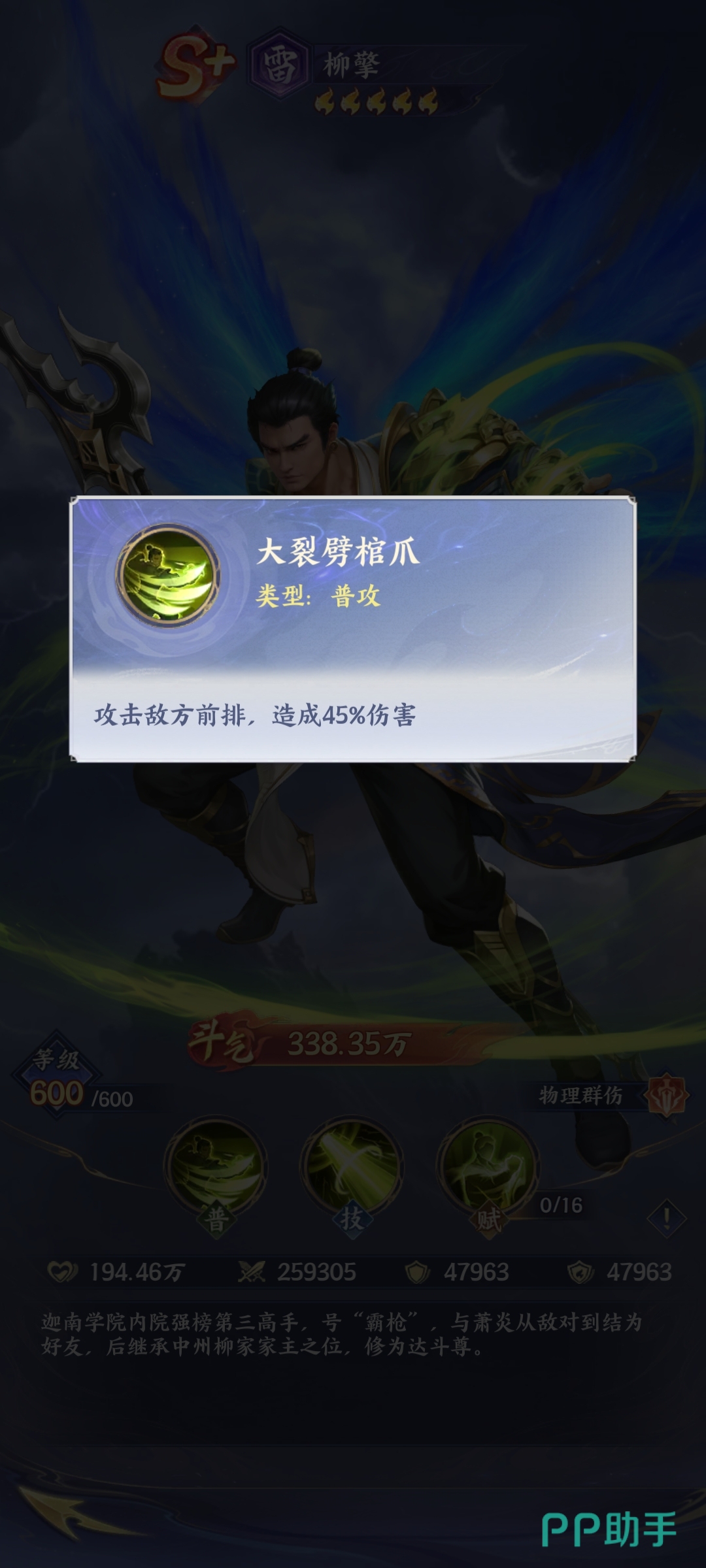 在技能体系设计上,柳擎以长枪突刺与凌厉爪击为标志性攻击手段,主打S级雷属性范围物理伤害。其外观造型鲜明:身着蓝金配色战袍,头戴翠绿色斗笠,背后浮现湛蓝色斗气羽翼,整体视觉风格兼具威严与迅疾感。普通攻击虽动作简洁,但附带高额前排穿透伤害,可稳定压制敌方核心单位。
