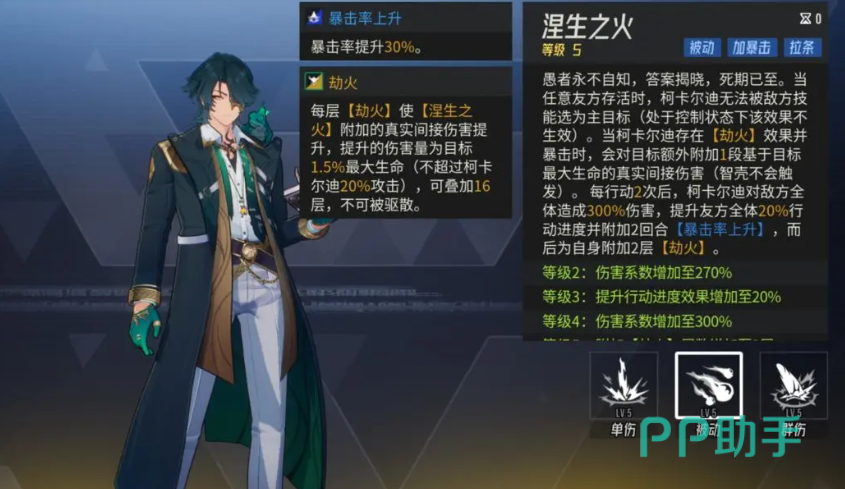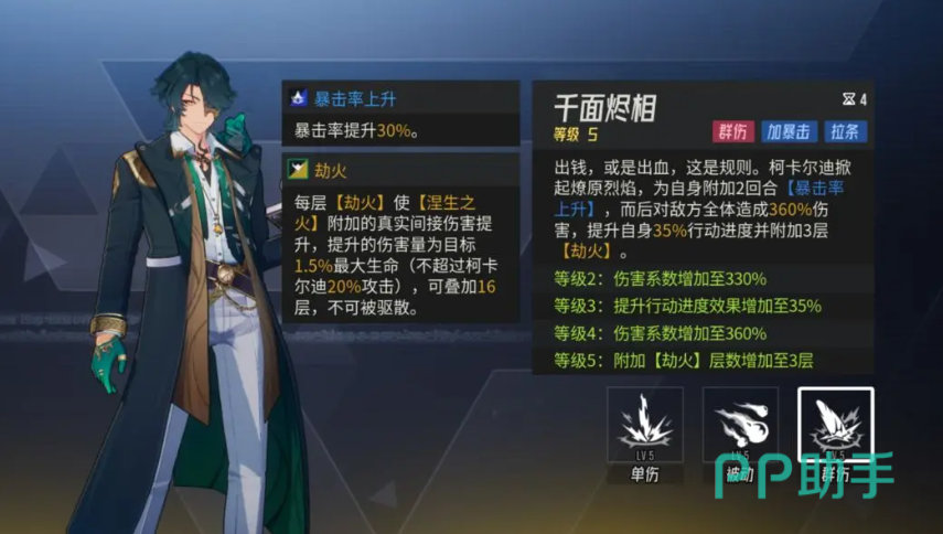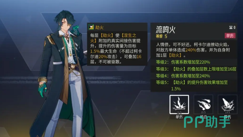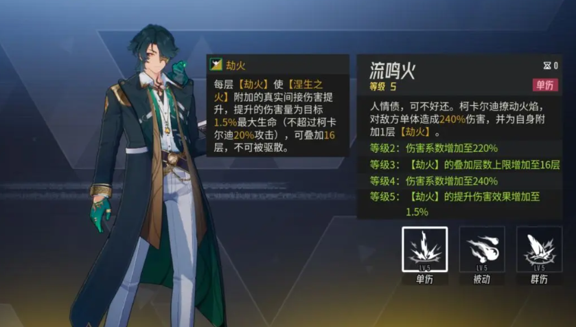 柯卡尔在剧情设定中担任海拉德银行经理人之首,是一位掌握实权的重要人物。他在战斗中的普通攻击名为流鸣火,能够对单个目标发动火焰属性伤害,造成高达240%攻击力的输出。与此同时,该技能还能为自身叠加一层劫火状态。这一状态关联的核心被动为涅生之火,每当劫火层数积累,即可提升真实伤害效果——每层可附加相当于目标当前生命值1.5%的真实伤害,上限不超过柯卡尔自身攻击力的20%。该效果最多可叠加至16层,并且涅生之火具备无法被敌方驱散的特性。