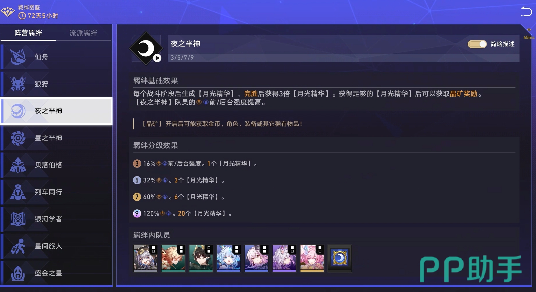 夜之半神属于资源积累型羁绊,玩家在每场胜利后可根据当前羁绊等级获取月光精华,当精华积满后可领取包含货币、装备及角色在内的丰厚奖励。这一机制使得该羁绊在长期作战中具备极强的发育能力。同时,由于多个拥有夜之半神标签的角色也具备燃血特性,因此两者可形成协同效应,例如7夜之半神+4燃血这类高爆发与高成长兼具的组合便十分常见。