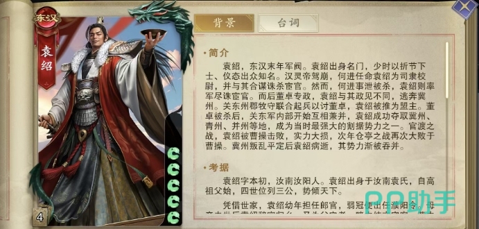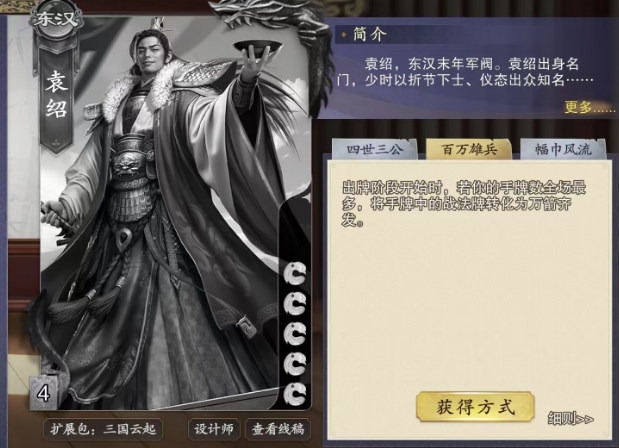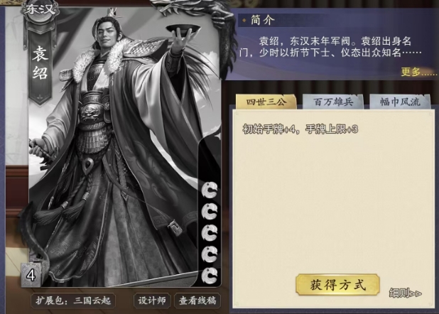 在众多武将中,袁绍他的三个技能相互配合,能够为击杀创造极为合理的条件,因此被广泛认为是第一梯队的武将强度卡,其中四世三公作为他的一技能,更是让人眼前一亮,这个技能初始手牌+4,手牌上限+3,其效果非常直观且强大,在游戏开始时,袁绍就能拥有比其他武将更多的手牌,这意味着他有更多的资源和机会去发动攻击、防御或执行其他出牌策略,同时手牌上限的提升也保证了他能够更好地保持手牌数量,避免因手牌不足而陷入被动局面。