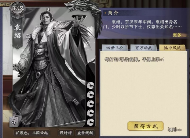 除了百万雄兵之外,袁绍的三技能幅巾风流也不容小觑,这个技能每打出3张装备牌,就能让袁绍的手牌上限+1,并且这个效果会持续到游戏结束,这意味着,随着游戏的进行袁绍的手牌上限会越来越高,他能够持有的手牌也会越来越多,这不仅增加了袁绍的资源储备,还让他在后期能够更好地应对各种挑战和困难。