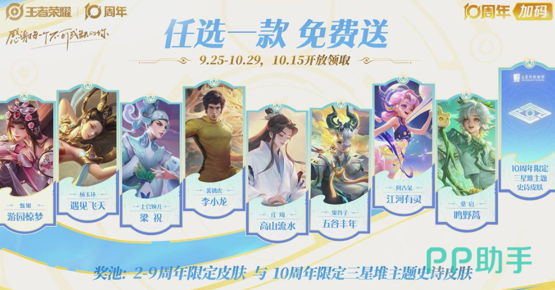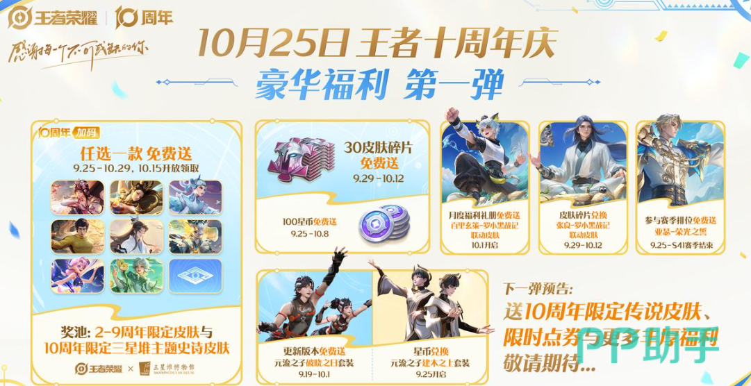本次十周年庆典将于10月25日正式拉开帷幕。首波活动中最吸引人的莫过于史诗限定皮肤免费送。在活动期间,玩家可从第2至第9周年的限定皮肤中任选一款直接领取。若此前已集齐所有周年限定皮肤,则可额外获得一款全新的十周年专属史诗皮肤,该皮肤以“三星堆主题”为设计灵感,极具收藏价值。