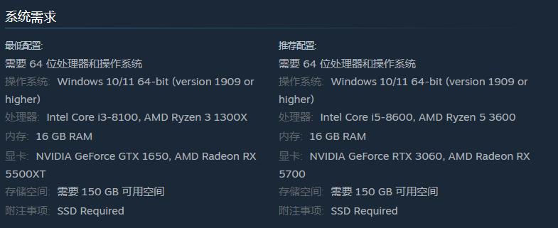 游戏最低配置为I3处理器、16GB内存、GTX 1650的N卡或RX5500XT的A卡,需预留150GB存储空间。推荐配置升级至Intel i5处理器、NVIDIA GTX 3060/AMD RX 5700显卡。且虚幻5引擎对多核心优化有限,更依赖单核性能,若设备低于最低配置,建议降低分辨率至720P并关闭抗锯齿。