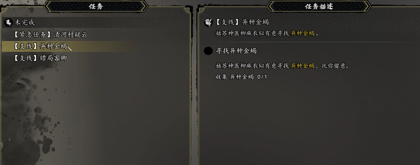 该道具的前置条件始于南疆清河村。完成铁蛋发布的“毒蝎夺命”任务后,需前往猴儿林左上方洞穴击败守关敌人,取得【异种金蝎】。此物是分岔点核心道具,后续走向完全取决于交付对象:交予商人可解锁霹雳门拳系支线;交予柳医生则开启五仙教剑系支线。两条路径奖励方向不同,但均会在中期引出“人面鬼蛛”相关委托,具备同等有效性。若跳过此环节或误选其他NPC,则大概率永久错失该道具。