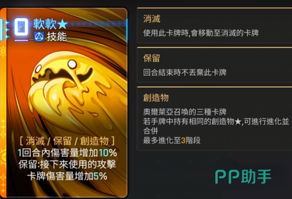 软软:0费,生效后本回合所有攻击卡伤害提升10%,且保留后续使用的攻击卡,使其额外获得5%伤害加成; 巧巧:0费,基础伤害倍率60%,若处于保留状态,则额外叠加40%伤害,采用加算方式,不依赖暴击或增伤乘区,适用于稳定高频输出场景; 壮壮:0费,提供80%护盾,若被保留,则触发30%治疗效果,兼顾生存与续航。