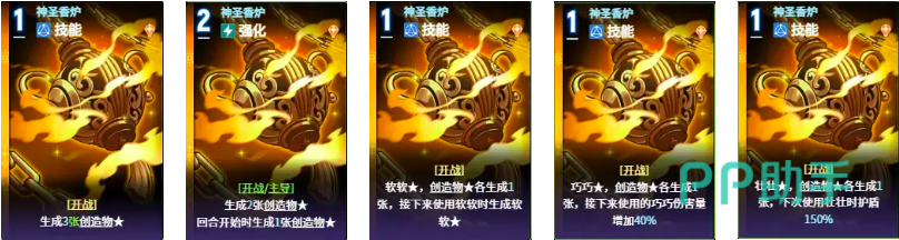 奥莱娅初始卡组配置为两张一费攻击卡、一张一费治疗卡,起手关键卡为专属一费卡“神圣香炉”。该卡在战斗开局即生成两张创造物,为整套循环提供稳定启动资源。三类创造物均具备“消灭”“保留”“创造”三重词条,是技能链衔接与策略延展的核心载体。