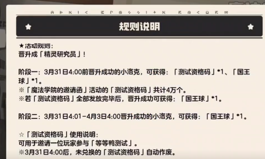 这次的活动中就有明确的规定要求必须要晋升到精灵研究院。如果在规定的时间内成功的晋升,就可以得到一个测试资格码,还能够获得一个国王球。这次测试的资格码总共会有4万份,在全部发放完之后如果继续的晋升,那么玩家就只能获得国王球。