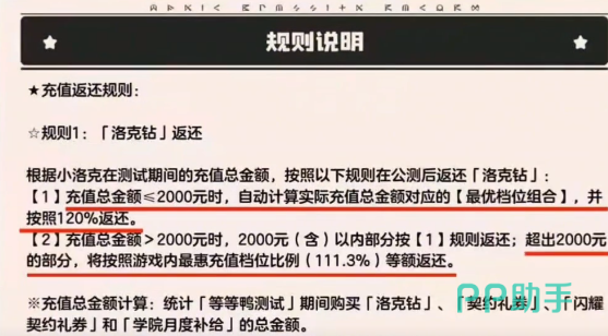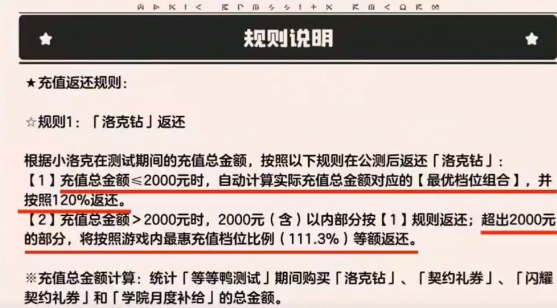 在当时的测试阶段,还有一个返还的机制。充值的总金额如果低于2000就会计算充值最优档位的组合,然后按照120%返还。如果充值的金额超过2000的部分,就会按照111.3%的等额返还。