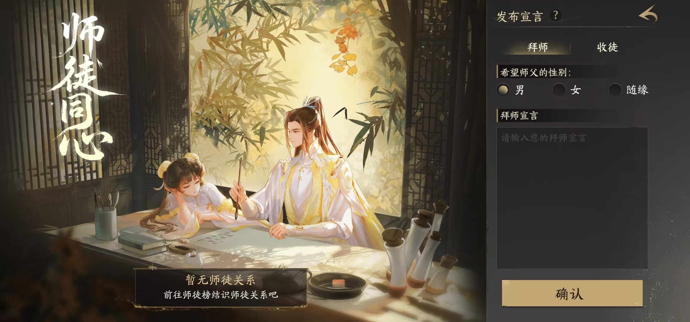 《天下万象》作为一款深度构建社交生态的武侠MMORPG,将师徒体系设计为贯穿玩家成长周期的核心机制之一。不同于简单的关系绑定,该系统融合了成长引导、战力协同、资源互通与情感联结四大维度,成为新手快速融入大荒世界、老玩家持续获得收益的重要纽带。