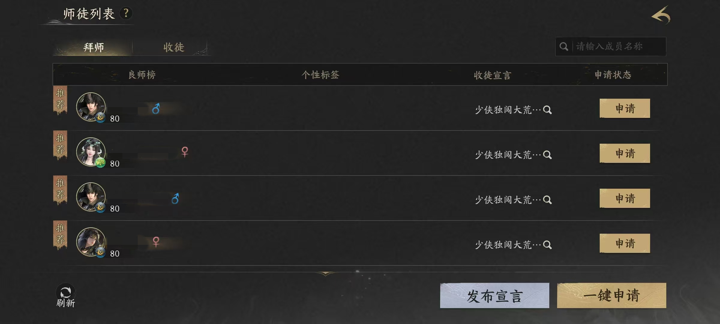 拜师与收徒流程高度透明化:符合条件的玩家可通过官方榜单发布意向,系统自动公示等级、职业、在线状态等关键信息。师傅收徒时需确保徒弟等级低于自身,但培养过程中若徒弟等级反超,原有师徒契约仍持续生效。关系解除方式包括师傅主动驱逐或徒弟申请离师,操作便捷且即时生效。