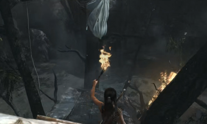 当五根支柱全部燃起后,第六根仍处于熄灭状态。观察现场,该柱位于燃烧阵列右侧,旁侧堆叠有木质货箱。玩家需先跳跃登上货箱顶部,再向上跃起抓握横梁,摇晃横梁使悬挂火盆坠落。火盆撞击货箱后引燃内部易燃物,火焰沿预设导火索蔓延,最终抵达第六根支柱底部完成引燃。支柱全部激活后,上方锈蚀飞机残骸结构失去支撑,轰然坍塌,暴露出下方舱门通道,即可进入最终密室获取宝藏。