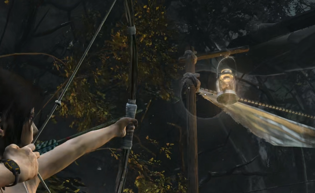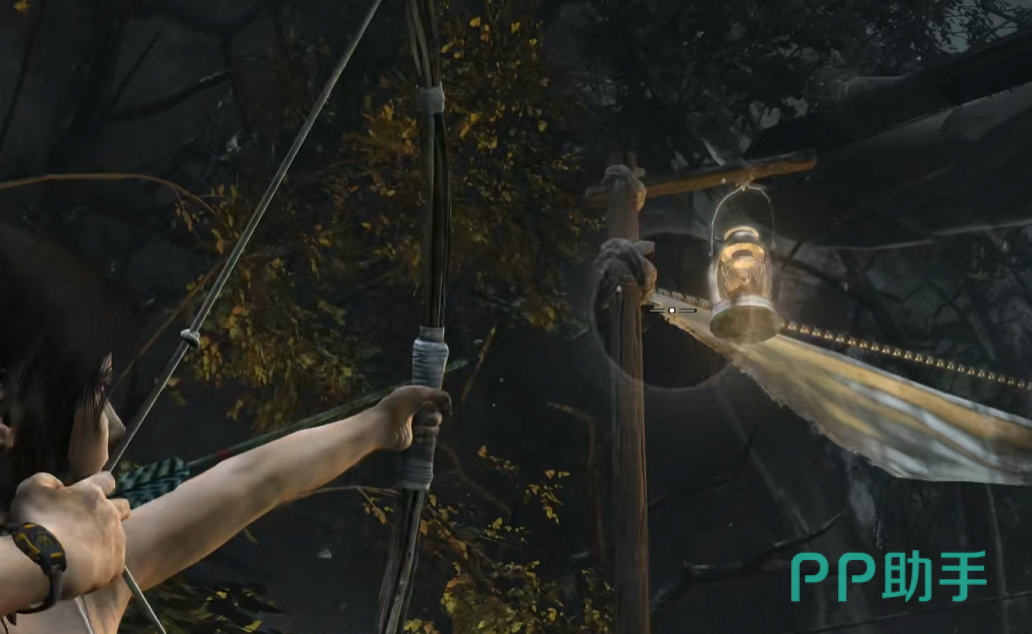平台中央陈列三只可拾取灯笼,需逐一捡起并向前方抛掷。灯笼落地后发出持续光照,照亮前方两根缠绕布条的竖立木桩。跨越木桩后,可见一具倚墙而坐的遗骸,其头顶悬吊一只未点燃灯笼。使用弓箭精准命中该灯笼,使其坠落引燃下方木质支柱。随后靠近支柱,按交互键将其推倒——倒伏方向将触发连锁燃烧,依次引燃路径上其余四根立柱。