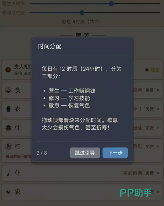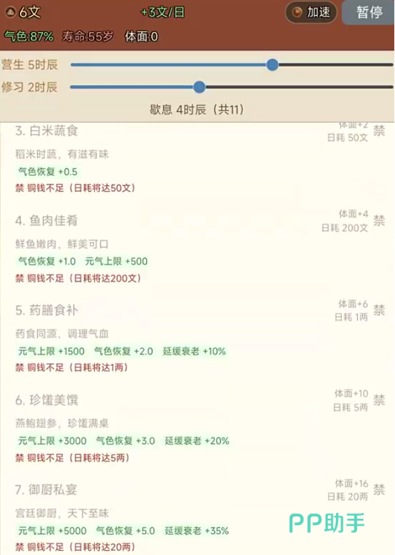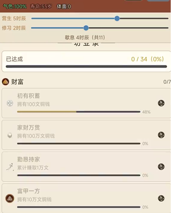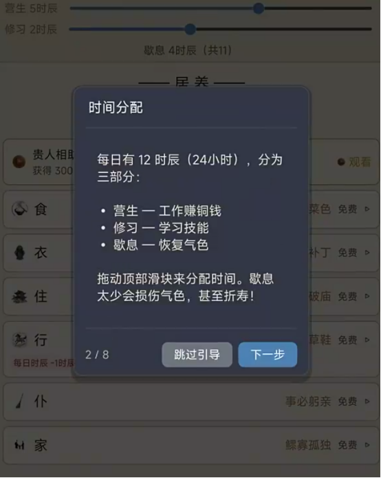 界面底部常驻行为栏提供“营生”“休养”“访友”“读书”“祈福”等基础指令,每项操作均关联具体属性增益与时效消耗。例如“居养”可缓慢恢复体力并提升抗病能力,“陈旧”则用于处理过期物资、规避霉变风险。所有行动皆受年龄与寿命限制,玩家需在有限生命周期内权衡短期收益与长期布局,真正践行“一命二运三风水”的古代生存哲学。