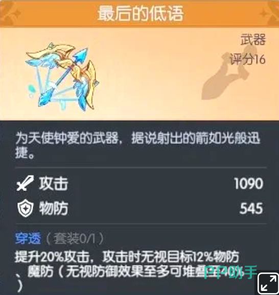该武器为橙色品质单手法杖,专精于破防增伤。装备后,塔萝丝每次攻击均可无视目标12%的物理防御与魔法防御,同时自身攻击力提升20%。此被动效果不依赖触发条件,全程常驻生效,大幅强化对高抗性BOSS及精英单位的压制能力。