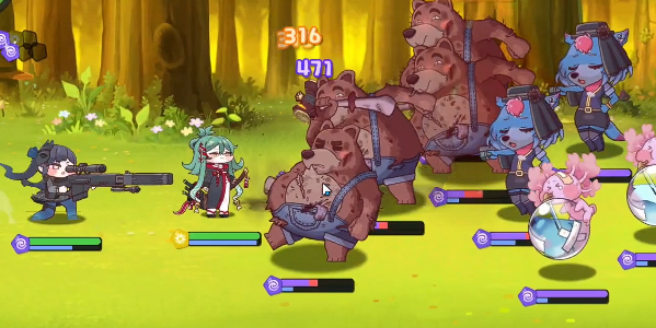 中排位置由赛琳娜和雨伊承担,二者均为群体伤害输出角色,擅长释放AOE技能打击多个敌人。得益于队伍共享的140%血伤加成,在面对被克制的敌方单位时,一次双重范围攻击即可清除大量目标,极大提升清怪效率。