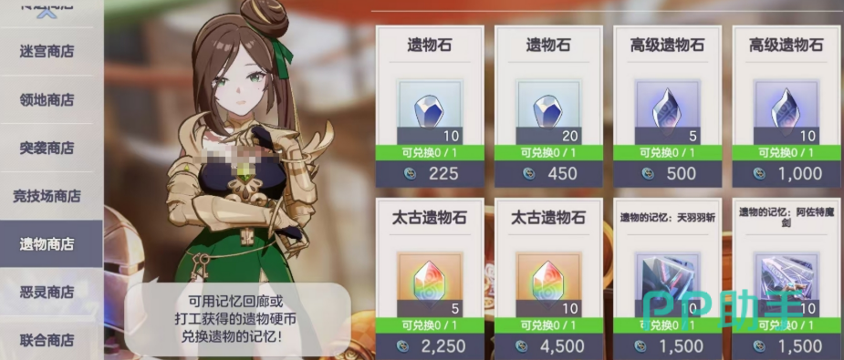 【遗物商店】仅接受遗物硬币,专用于史诗遗物升阶。当主力遗物均已升至满阶后,剩余硬币可兑换太古遗物石或高级遗物石;普通遗物石无需在此采购,记忆回廊副本稳定产出,足以覆盖日常需求。