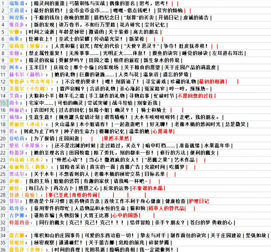 “时间之流逝”“年龄是秘密”“邀请函”“关于装修和离去的朋友”指向安娜;“灶神在上”“圣武士的荣耀”“劳动最光荣”“新菜肴”明确对应雨果;“精灵的祝福”“要解梦吗”“田园之歌”“相互陪伴的旅程”“新生泉水的传说”五项线索统一归于黛梦。