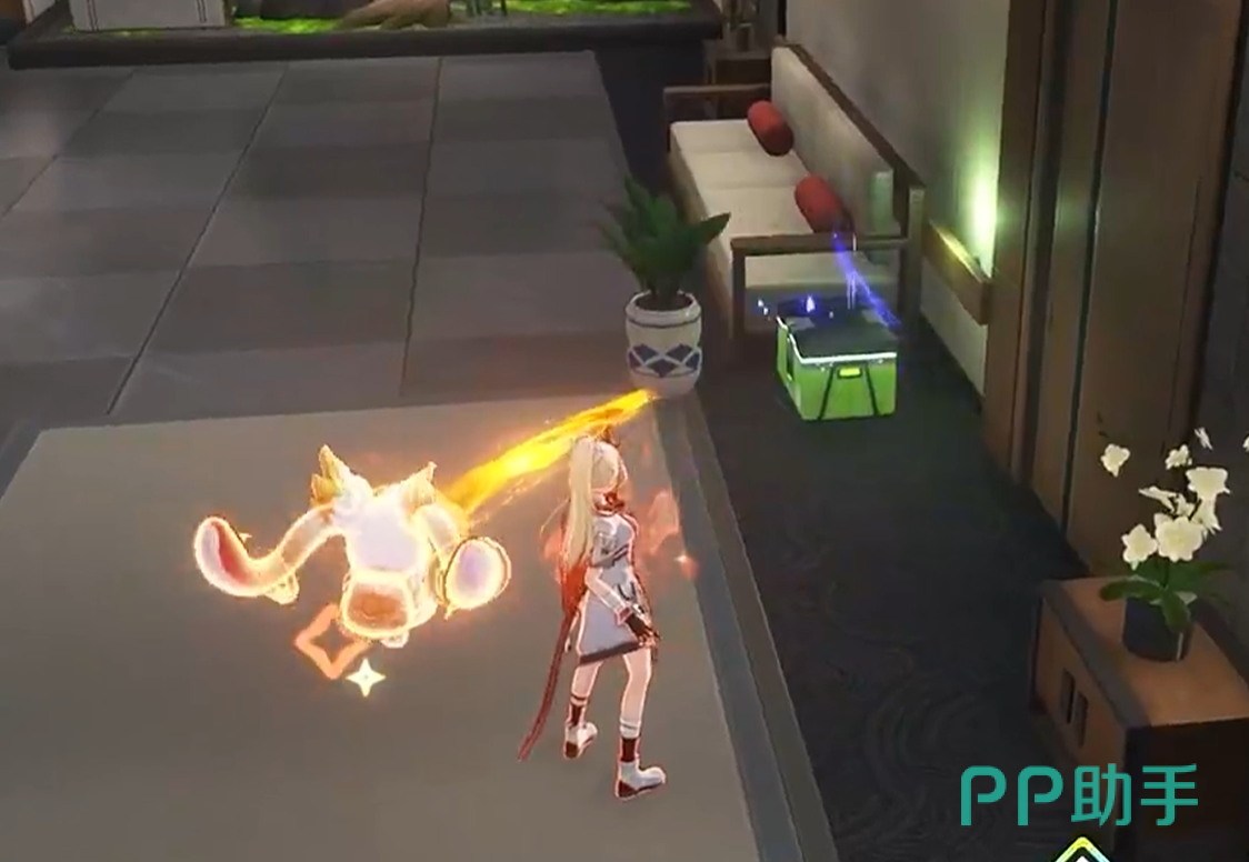 拾取首箱后无需下楼,立即转向大厅休息区——此处布置有沙发、屏风及配套矮柜,环境静谧但存在低威胁敌人。第二宝箱就置于屏风与柜体夹角之间,紧贴地面。由于该区域无明显战斗焦点,玩家视线多被远处出口或敌方单位牵引,导致宝箱被误判为静态布景。建议清剿周边敌人后,以环绕视角逐帧检查家具边缘,确保不遗漏。