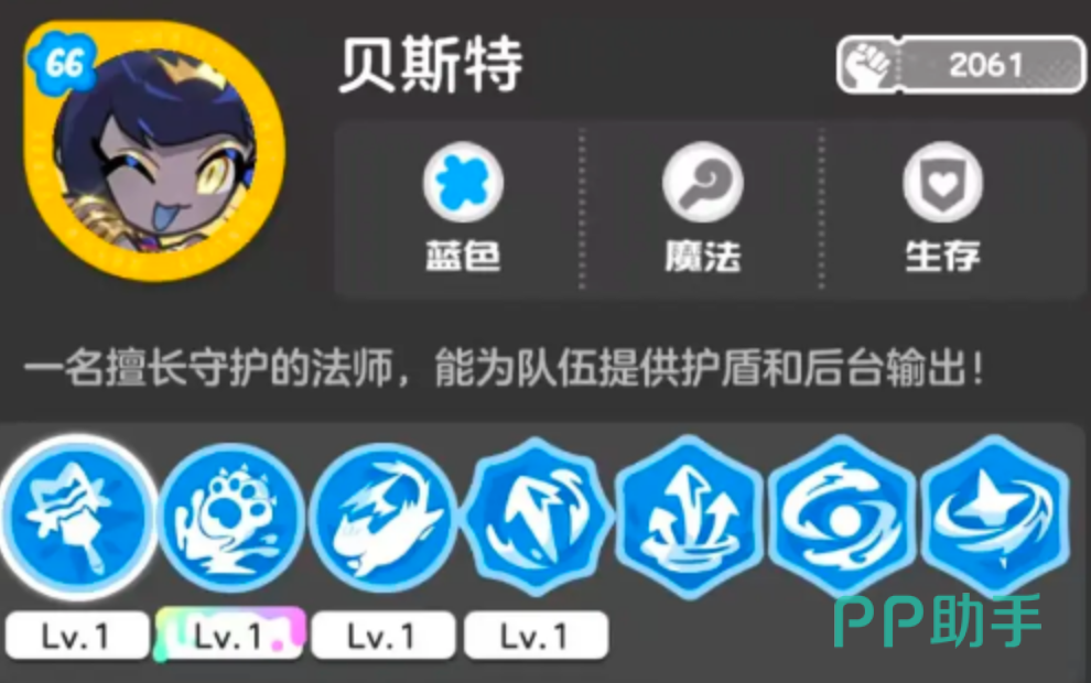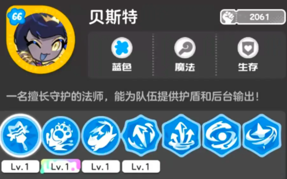 贝斯特是蓝系法术职业代表,主司团队防护与中远程火力支援。其核心机制围绕“能量护盾”展开:释放技能时生成覆盖全队的蓝色范围护罩,持续吸收物理伤害,显著提升队伍容错率与续航能力;配合高机动性位移技能,可快速调整站位、规避集火,保障前排生存与后排输出环境稳定。