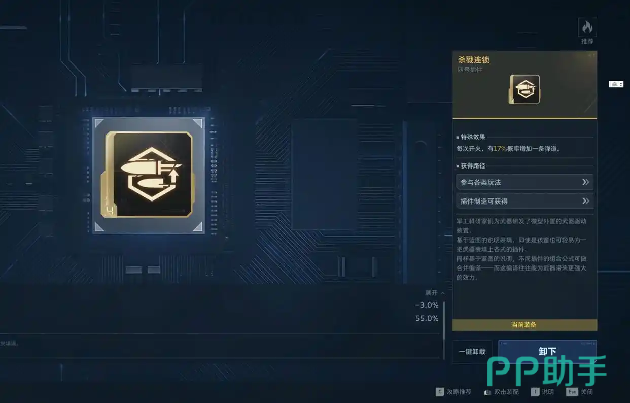 2号插件推荐“出其不意”:将主动技能切换为“扔枪爆炸”,兼具高爆发与弹匣重置双重收益,特别适合近身突袭或应对突发包围;Boss战场景建议选用“攻守自如”,释放主动技能后全伤害提升30%,强化关键阶段输出密度;群体清场向则优先“杀戮连锁”,提升17%分裂概率,进一步放大弹道复数打击能力,让步枪获得类霰弹覆盖效果。