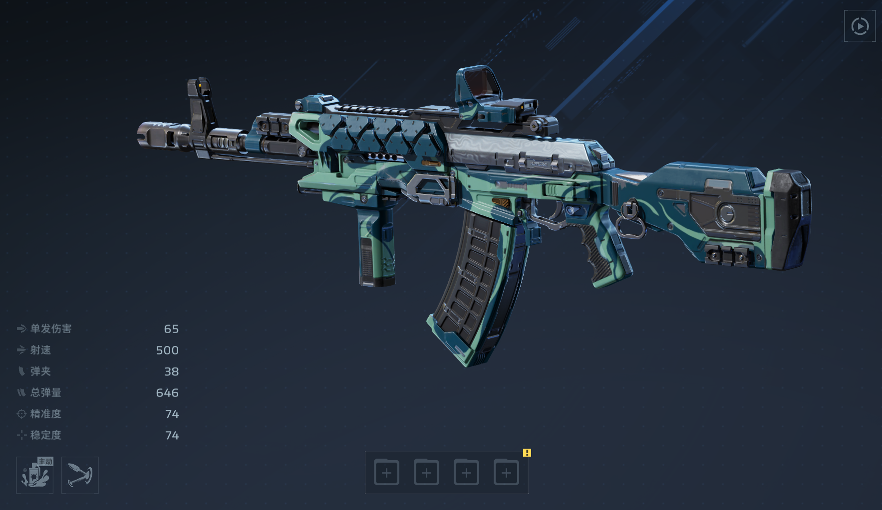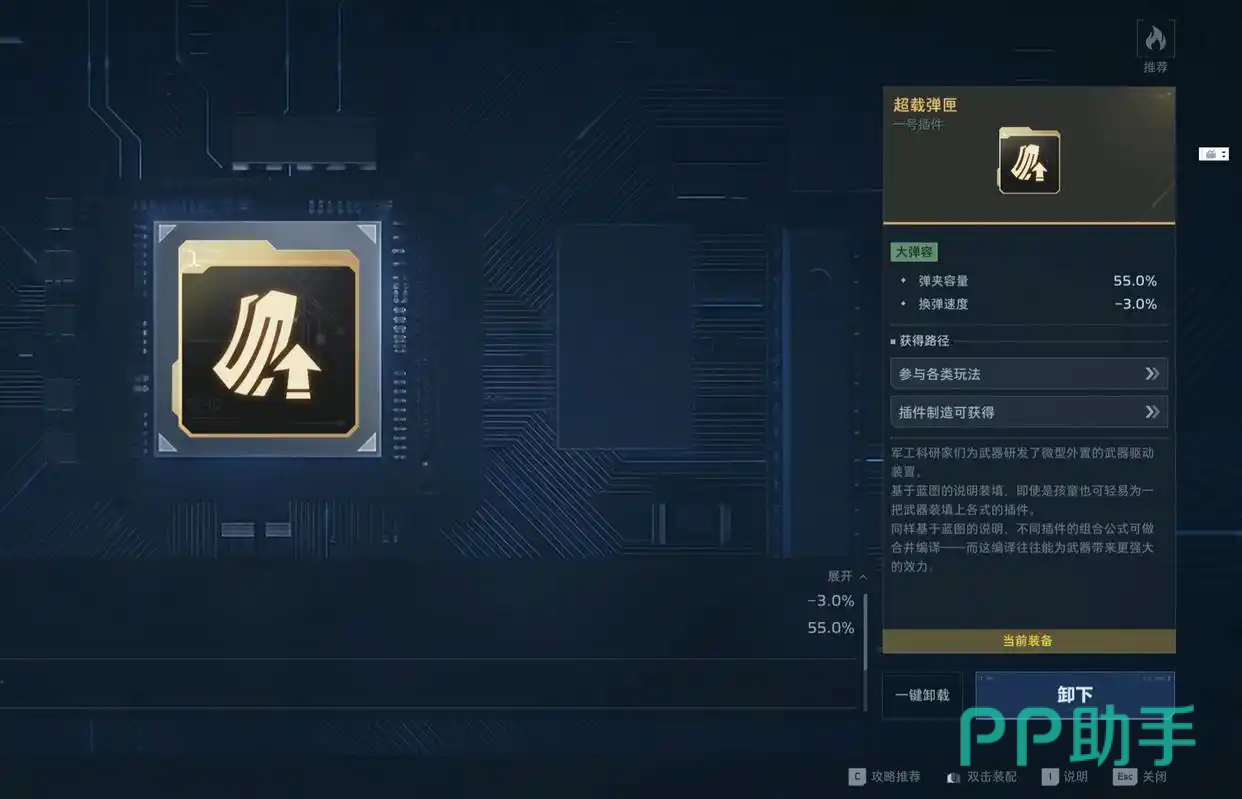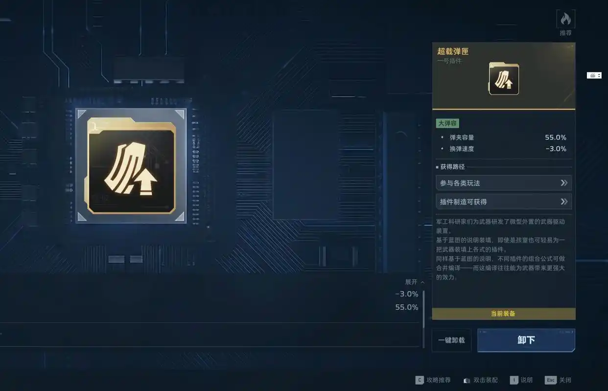1号插件首选“超载弹夹”:提升弹匣容量80%,38发→69发,显著延长单次压枪时间,保障分裂弹持续触发频率;若暂未获取,可暂用“充能弹药”替代——释放主动技能后子弹自动回满,实现技能+射击无缝衔接。