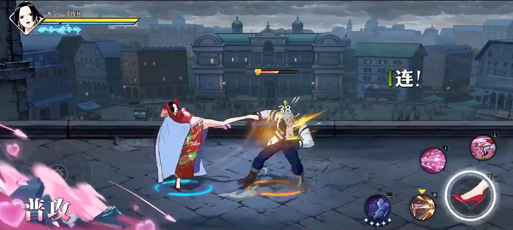 普通攻击共五段:前两段为高速连环踢击;第三段释放“吻枪”,造成中程突进伤害;随后接续三段新踢技,将目标击飞并重踏压制;最后一段支持松开后再次点击触发连续“吻枪”,形成高频输出节奏。