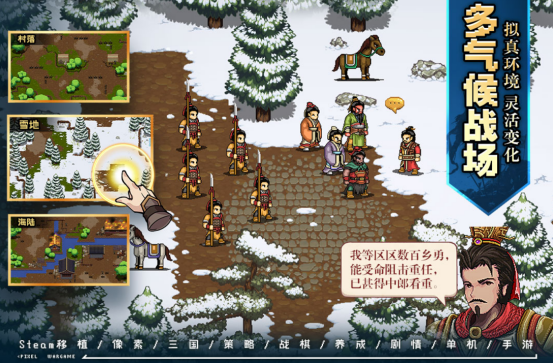 经典的像素风格将会让玩家走入到刺激的三国战场当中,还以策略战争为主要题材。您在其中可以亲自感受到三国时期的各种历史战役,比如官渡之战以及赤壁之战等等,还有众多优秀的历史名将等待玩家共同协作。您可以通过招纳曹操关羽等人,在战场当中大杀四方,这些人物都各有千秋,有的善于出谋划策,有的善于带兵打仗。