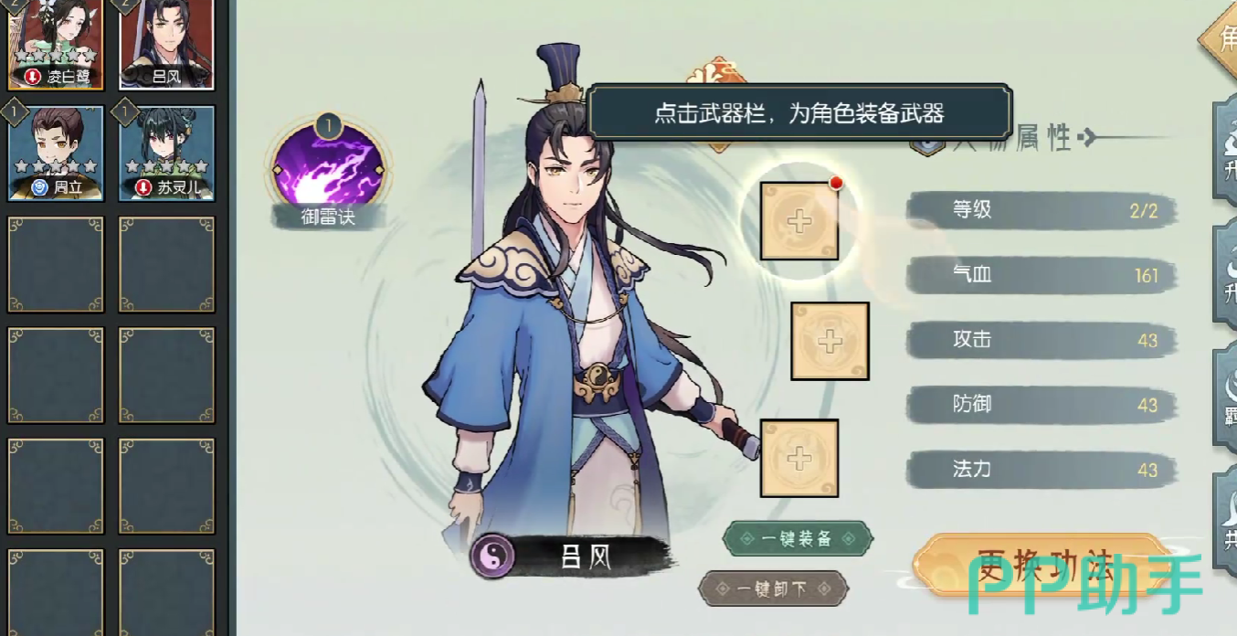 吕风在游戏当中的级别为红色属性, 他的基础属性值为雷属性,拥有的专属技能为御雷决,在等级初始的状态之下,吕风可以拥有气血161点,攻击数值是13点,防御数值43点,法力数值43点,是游戏当中综合性比较强的一个角色,在针对前期推图的情况下,吕风有着不错的发挥。